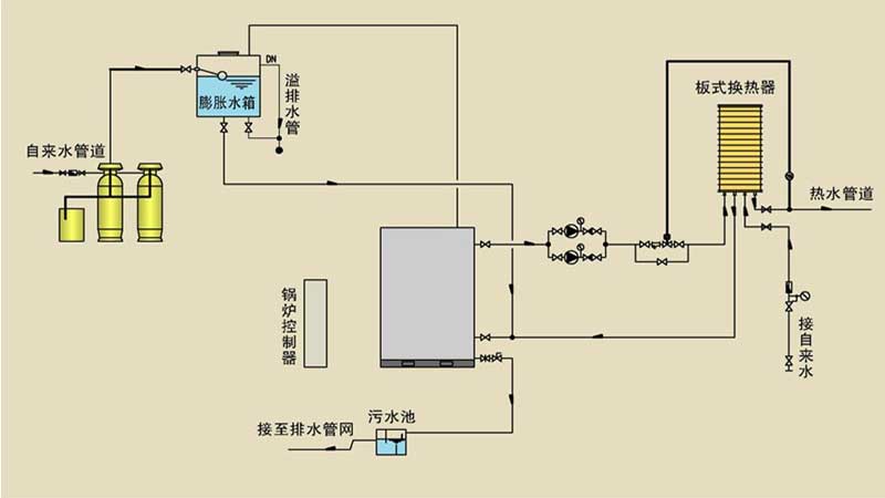 机电分体安装,电控元件远离热源,有利散热。可单台或多台并联使用。 PLC微电脑可编程控制及显示屏; 通过人机界面实现温度设定自动控制出水温度。显示屏可显示设备状态运行参数及故障报警。